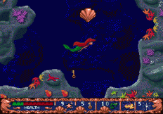 Help either Ariel, the gleeful little mermaid, or Triton, her father, foil the evil Ursula, who has transformed everyone into small, green worm-like creatures, including the character you dont initially choose. Rescuing requires you to simply swim into the unfortunate little victims as they hang about at fixed places in the watery world; while fending off and dodging enemies like eels, clams, sharks, and several other sea meanies. Friends like Flounder and Sebastian can also be summoned for a little helping hand. www.Mobygames.com
