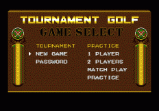 Select your level of play, and then head for the pro shop to choose between Black Carbon, Glass Fiber, and Ceramic Clubs. Tee off by yourself or play 18 holes with a friend. Besides the One and Two Player modes there's also a practice mode, match play (head to head), and a full-blown international tournament, where you'll stroke it out against 15 competitors. Tournament play lasts 12 rounds, 18 holes of golf each. Most rounds are standard „stroke“ play but the seventh and eighth rounds are „match“ games. Things really get serious when match game ends in a tie, and players move into a sudden death play-off. During the tournament players earn higher skill levels, more knowledgeable caddies, and more power. You'll earn a password at the end of each round of the tournament. The game let's you play on three different courses; Japan, the United States, and Great Britain. - www.Mobygames.com