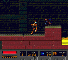 Drückt schnell A + B + C an Controller 2 sobald der Satz „Foley High Tech Systems“ auf dem Bildschirm erscheint. Ein Klingelton sollte nun ertönen und die korrekte Eingabe bestätigen. Eine unbegrenzte Anzahl von Leben, alle Waffen und vieles mehr werden nun verfügbar sein.