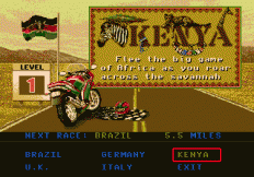 This is the third part in the original Road Rash series. You start off with $1000 and a lousy bike. As you progress in the races, you may divert yourself to the bike shop to get a new bike or important upgrades: a new engine, protection, … By placing well in races, you will receive a certain amount of money. That money can then be used to buy faster and more competitive bikes later down the road. The races take place across different countries that span every corner of the world, all represented in a stereotypical manner. In the UK, cars drive on the left and there is rainy weather. In Kenya, animals will cross the road and you will hear some funky tribal beats. Of course, this isn't an ordinary racing game. While racing, you can engage in fighting: punches, kicks, but real weapons as well: crowbars, clubs, chains, a cattle prod, nunchakus, and maces. The game is spiced up with humourous situations: funny winning screens, jumping over cows and the mighty crashes. www.Mobygames.com