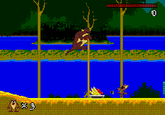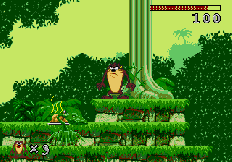 One evening, Taz's father is telling an intriguing tale. Somewhere on Tazmania is a Lost Valley, and in that valley nests a huge seabird, so huge that one of it's eggs could feed a family for a year! Just think of the omelette one of those could make! Thus Taz becomes fascinated and leaves in search of one of those eggs before his Dad has even finished the story… Taz can Jump, perform a Spinning Jump and a Spin Attack. Munch roast chickens to replenish life. Gain extra points by moving quickly through the levels - there are six stages and each stage has two rounds. www.Mobygames.com